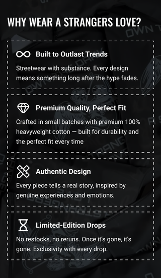 A Strangers Love was founded with a mission to capture real, unspoken moments through apparel that turns raw experiences into wearable stories of vulnerability, resilience, and human connection.