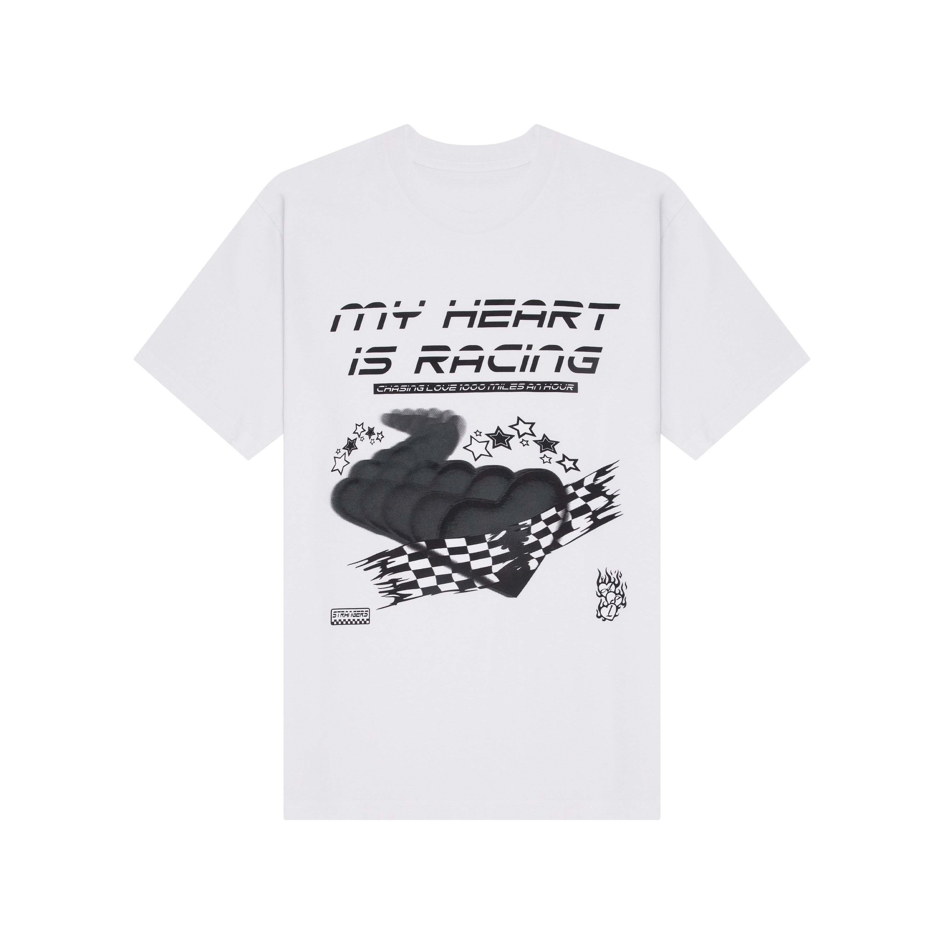 - High-contrast white-on-black street racing-inspired graphic with checkered flags, racing hearts, and custom star detailing